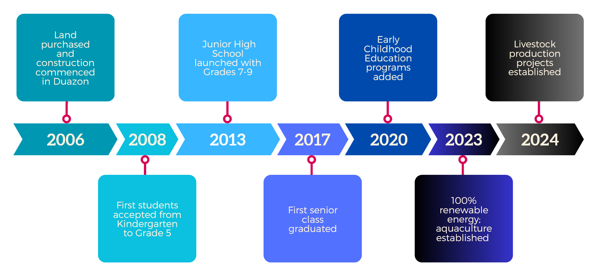 To implement a comprehensive suite of programs targeting literacy, nutrition, vocational skills, agriculture, health, and extracurricular activities for students from low-income families and communities in Duazon and neighbouring areas.
